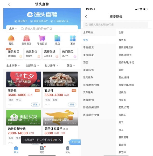 以美团APP内的“馒头直聘”界面为例,目前一级菜单栏中显示的招聘领域为餐饮、美容美发、零售百货、酒店,其他家政、运动健身、司机物流、教育等领域需要进入“更多”二级页面浏览,招聘职位大类共11中,每一大类下面有细分职位。