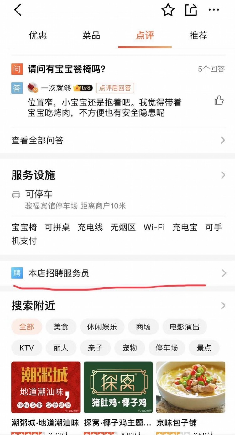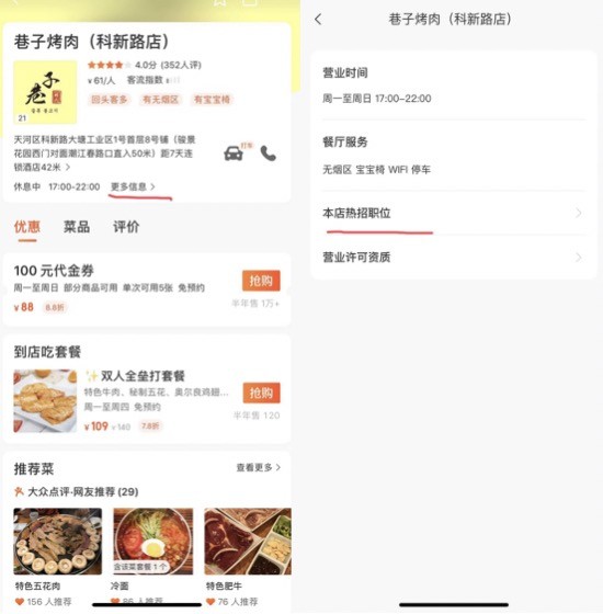 可以看到,在美团APP中,用户可通过“更多信息”进入“本店热招职位”,APP随即会跳转至“馒头直聘”;而在大众点评的APP页面中,用户需下拉才能看到“本店招聘服务员”,点击后直接跳转至“馒头直聘”入口隐藏比美团APP更深。