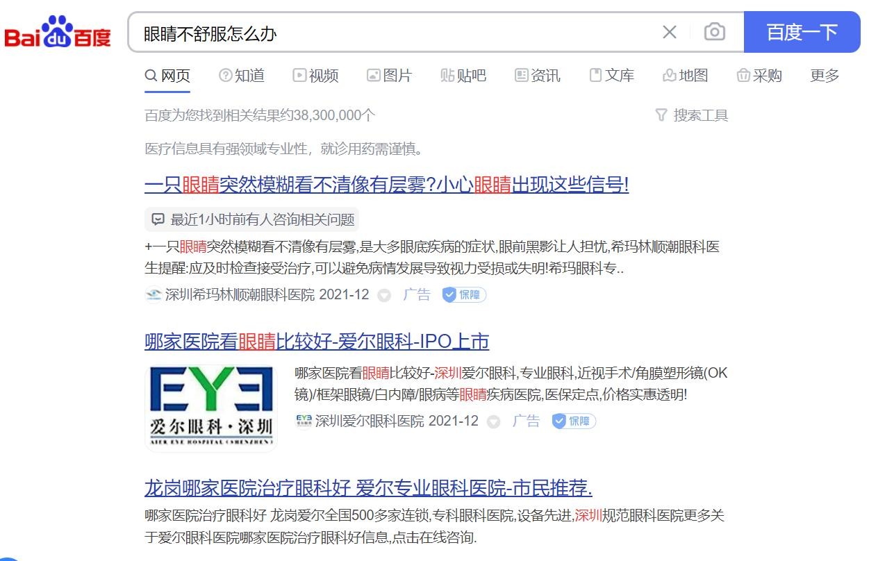 就比如说,搜索“眼睛不舒服怎么办”,在其他搜索引擎的搜索结果,靠在最前面的无疑都是广告,你得往下滑动去寻找你想要的答案,并且结果信息都比较的杂乱。