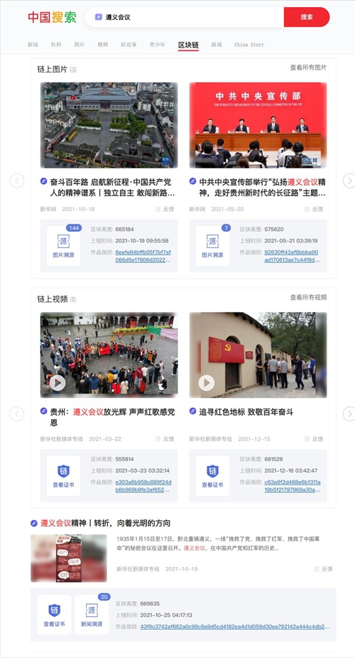 并且还打造了全国首家媒体融合链,区块链搜索能够给作品加上独一无二的作品指纹,能够给图片、视频、文章等上链存证、一键溯源,方便作品维权。