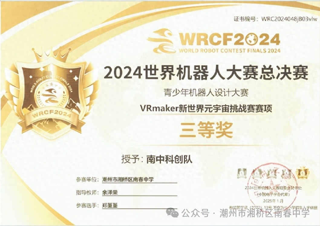 在刚刚落幕的2024世界机器人大赛总决赛中,南春中学高二级学生郑堇堇凭借作品《智能校园教学楼》在VRmaker新世界元宇宙挑战赛赛项中脱颖而出,荣获全国三等奖!这是继我校在多项科创赛事中获奖后,又一次在国际级舞台上展现硬核实力的荣耀时刻!