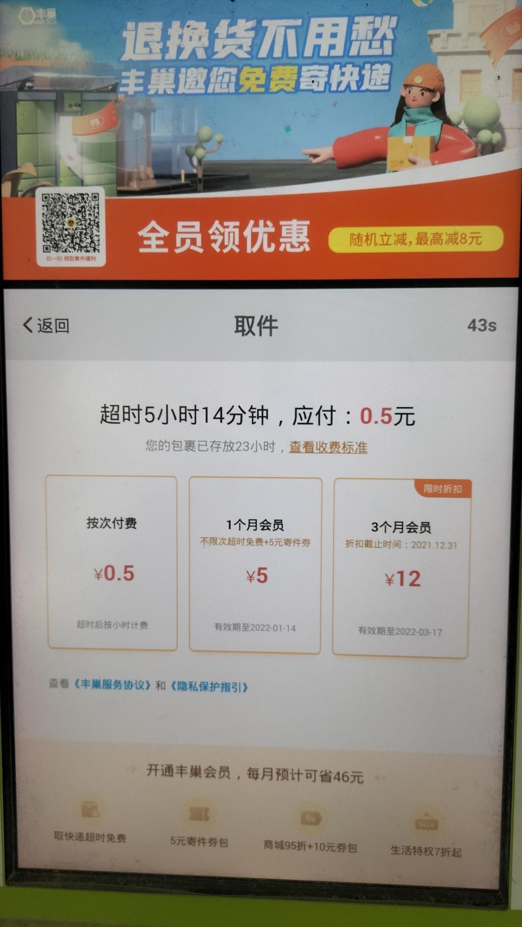 “当时爱人就说是前一天就放进去了,让我快点去取,以免超时。”吕先生说,“一直知道丰巢有延时赞赏,但是上个周取快递时候,还可以跳过进行免费取件。这次没想到输入完取件码弹出来的付费界面直接不能跳过,必须要缴费才能取件。”根据吕先生提供的当时取件界面照片来看,他的快递件存放了23个小时,超时5小时需支付0.5元的取件费。取件界面除了显示按次收费0.5元外,还有包月5元及包季度12元两种付费模式。