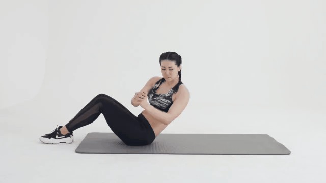 初级俄罗斯转体:首先坐在瑜伽垫上面,然后收起双腿,后脚跟轻轻的碰触瑜伽垫,腹部用力收紧,上半身抬起来,双手合十,十指相扣,呈水平状态。呼气的时候转动上半身向一侧,双手合拳,轻轻的点一下地面,在吸气的时候,恢复身体,上半身双臂伸直,再一次呼吸的时候,转动上半身转向另外一侧,拳头轻轻点击地面反复循环,注意的是,全过程要保持呼吸自然流畅,千万不要憋气,也千万不要依靠惯性来转动身体,用心去感受每一次转体的时候腹肌发力的感觉,左右转动各十次。