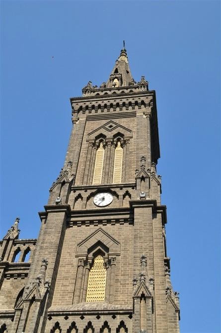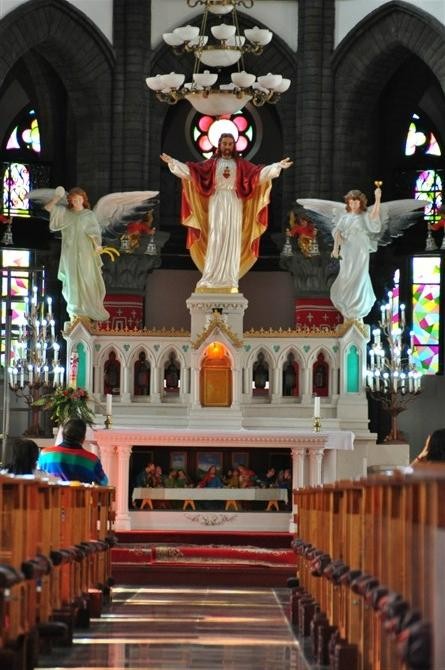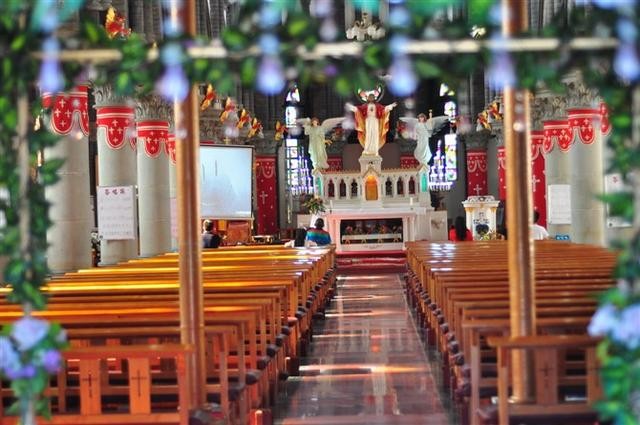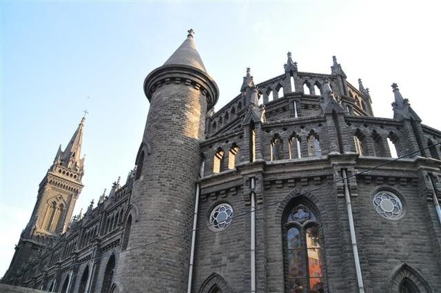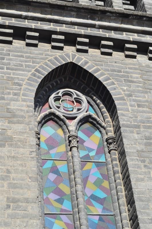 教堂在东院,坐北朝南,南北长66米,东西宽17米,通高40米。砖混结构,青砖素面,正面顶部突出有两个方锥形尖顶,上部装饰有“十”字架。建筑面积为1,100余平方米,有堂字120楹,整体建筑格局沿袭了欧洲文艺复兴时期的建筑形式,是典型的哥特式建筑。