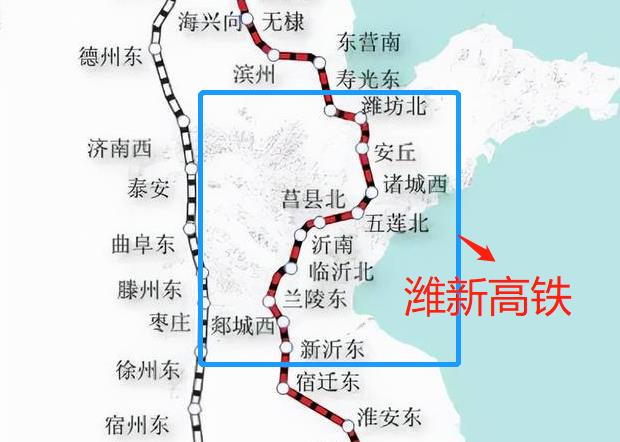 潍新高铁,是京沪通道的重要组成部分,连接着津潍高铁,从山东境内进入至江苏省,从潍坊北站出发,最终到江苏的新沂东站,线路全长330公里,设计时速350公里。沿线共设有10个车站,他们分别是:潍坊北、安丘、诸城西、五莲北、莒县-沂水、沂南东、临沂北、兰陵东、郯城西、新沂东。