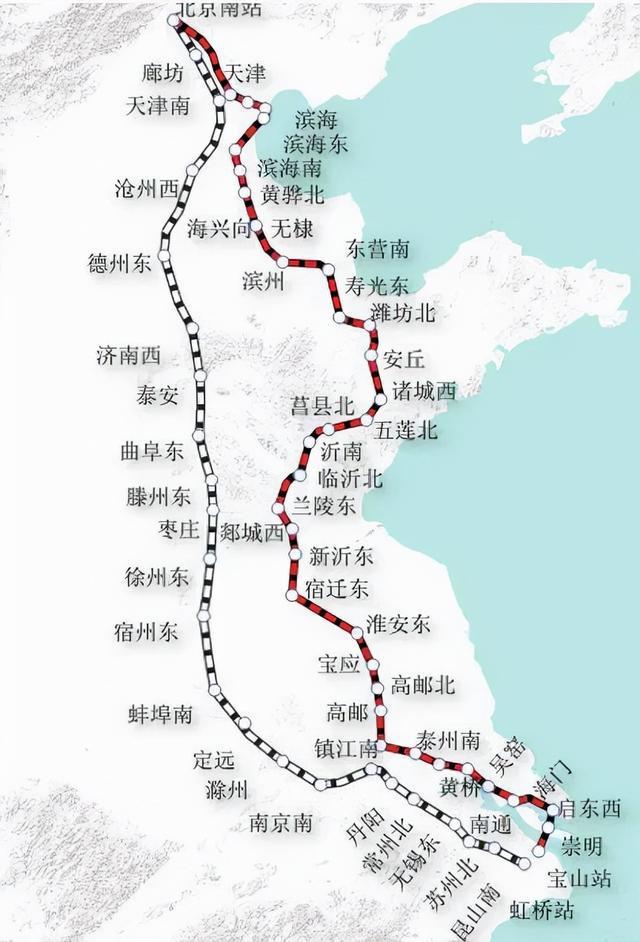 京沪高铁二线,基本与京沪高铁成相对平行的走向,从位置上来说,更进一步地靠近海边。从分段来看,可以看成是由这6条高铁组成,他们分别是:京津城际铁路、津潍高铁、潍新高铁、新淮高铁、连镇高铁(部分复用)、北沿江高铁(部分复用)。