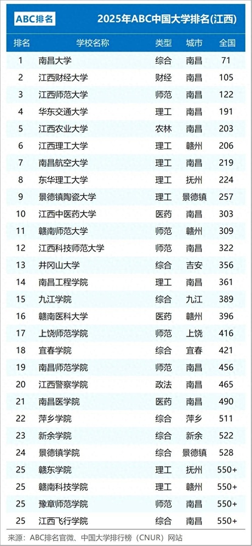 江西省高校排名大调整:江财第2,科技师大第12,赣东学院第25