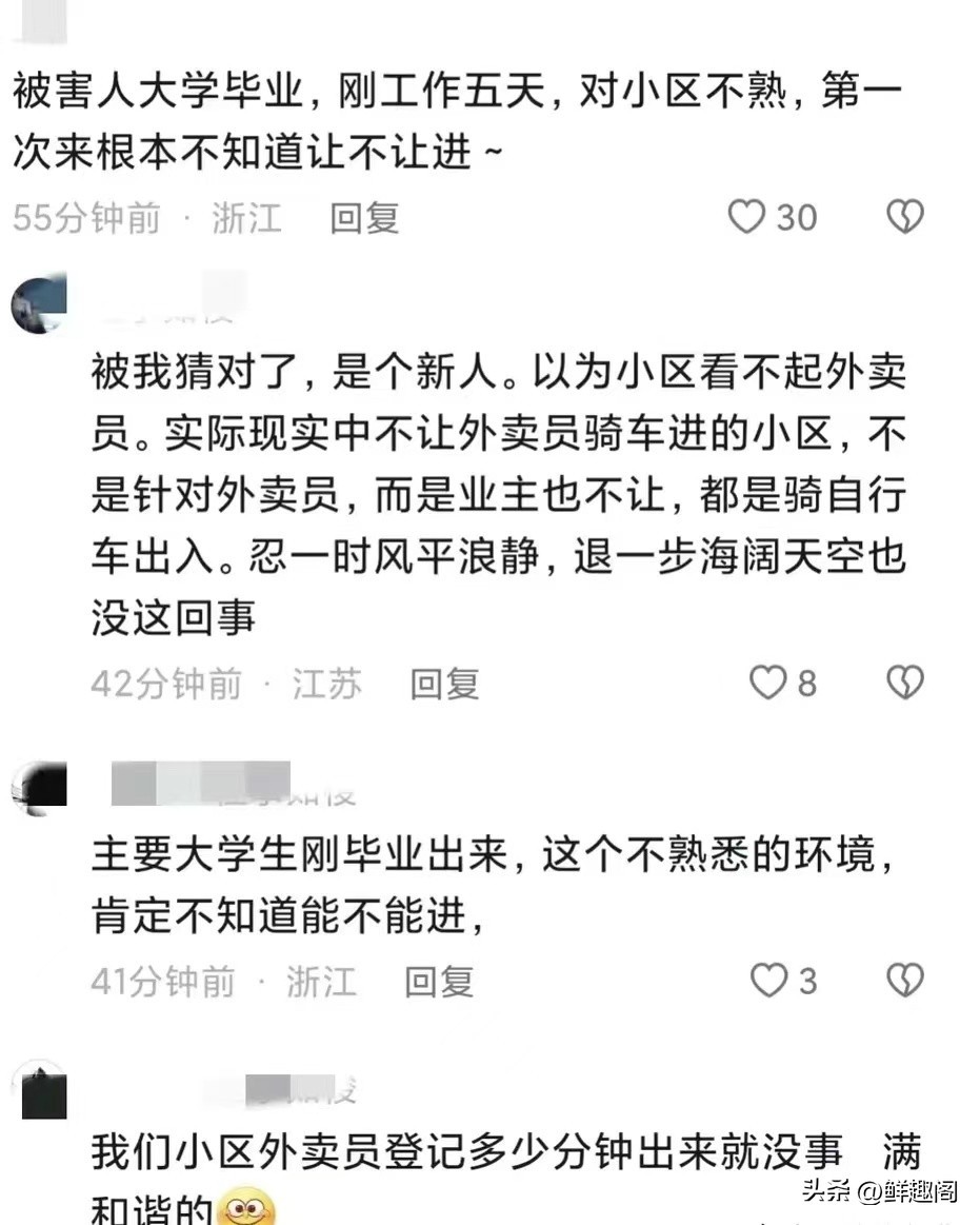 其实这种情况很多人都清楚,有一些小区非常大,外卖员如果不能骑车进去的话,步行需要很长的时间,为了达到工作效率和节约时间希望可以骑着车进,这本无可厚非。当然,小区有这样的规定,也是有原因的。但是规矩毕竟是死的,如果可以稍微地改变一些,或许就会避免一些没有必要的纷争。