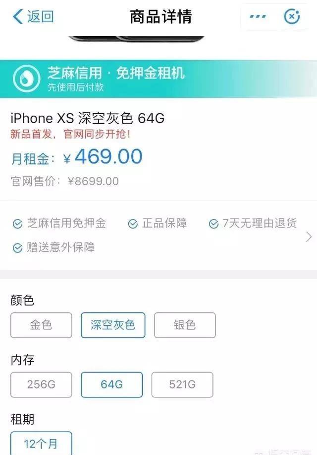 我们以iphone XS为例,我的芝麻分是730,按说应该可以免一丁点押金吧,然而看看下面的套路就知道了。